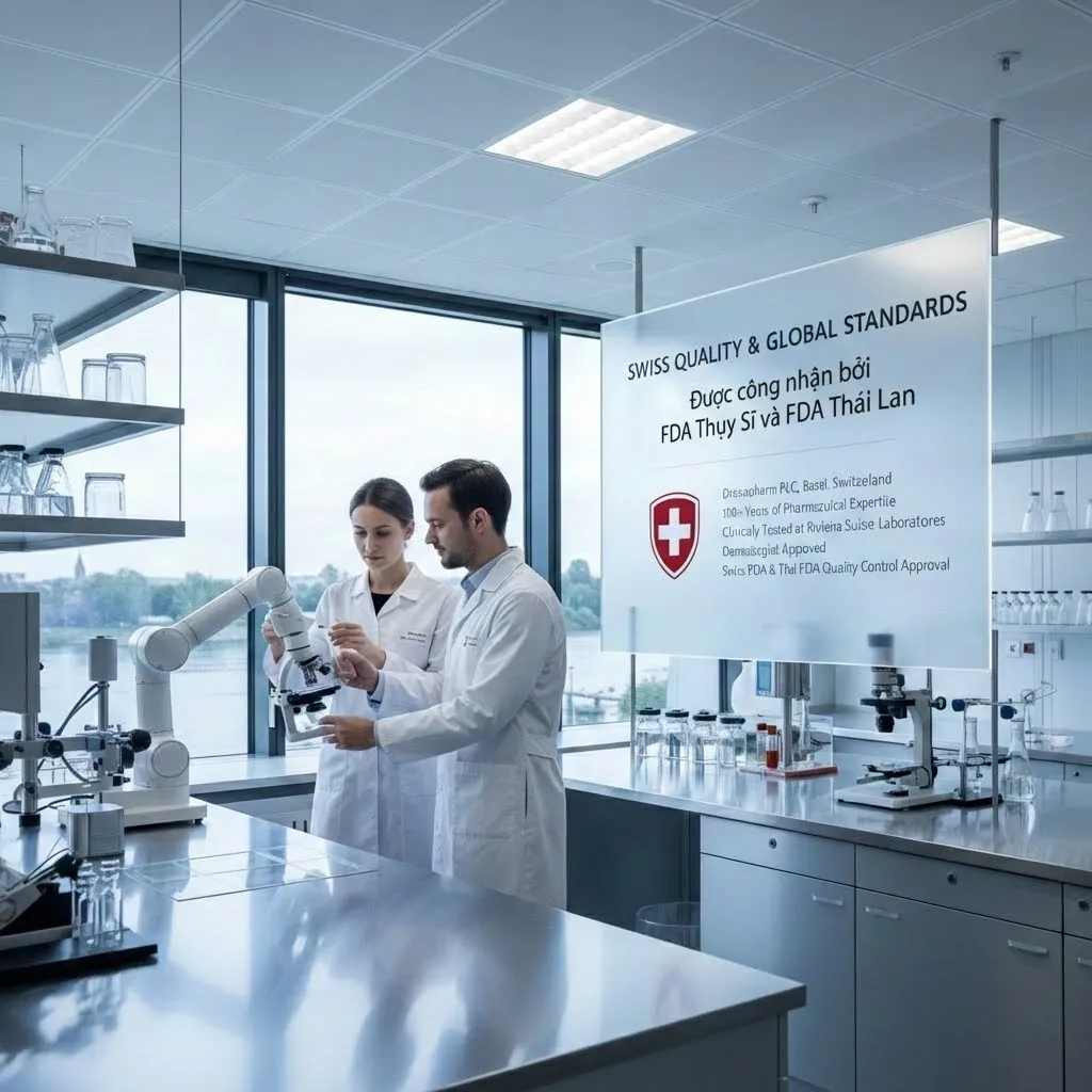 Chúng tôi tự hào duy trì các tiêu chuẩn chất lượng toàn cầu của Thụy Sĩ. Công ty mẹ của chúng tôi là Drossapharm PLC tại Basel, Thụy Sĩ đã được thành lập hơn 60 năm, với 100 năm tích lũy chuyên môn sâu rộng về dược phẩm của các nhà nghiên cứu và nhà sáng lập. Tất cả các sản phẩm của chúng tôi đã được thử nghiệm lâm sàng tại Phòng thí nghiệm Riviera Suisse ở Thụy Sĩ, cũng như được thử nghiệm bởi các bác sĩ da liễu chuyên gia. Chúng tôi đã đạt được sự chấp thuận kiểm soát chất lượng từ cả FDA Thụy Sĩ và FDA Thái Lan không chỉ đối với các sản phẩm của chúng tôi mà còn đối với quy trình sản xuất của chúng tôi được các nhà khoa học giám sát chặt chẽ. Do đó, chúng tôi đảm bảo chất lượng cao nhất.