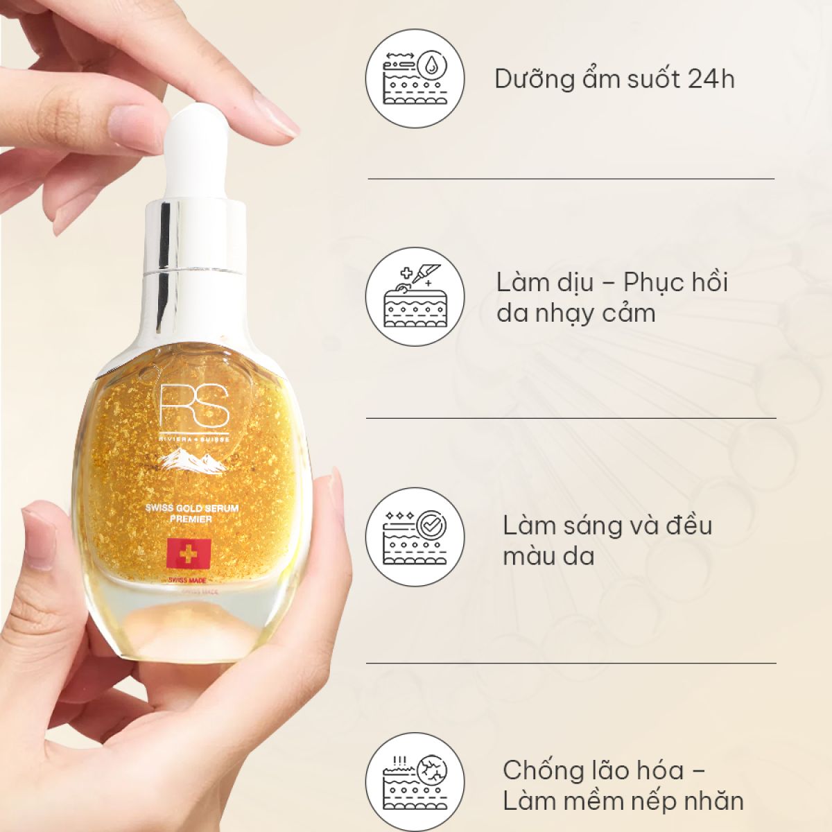 Vàng Thụy Sĩ là vàng 24K tinh khiết, giúp chống oxy hóa, làm sáng da và tăng hiệu quả hấp thụ dưỡng chất cho làn da khỏe và rạng rỡ hơn.